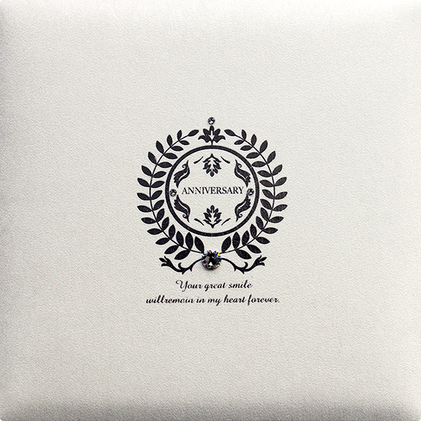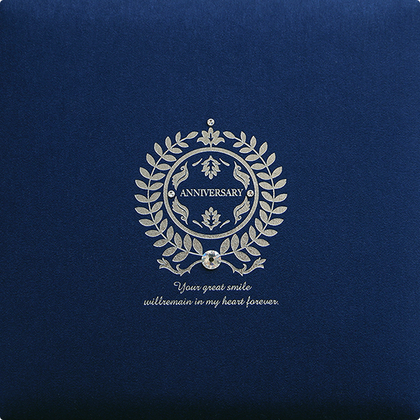 品のあるドークレサテン地に高貴なエンブレムと大粒のクリスタルガラスをあしらった存在感ある表紙です。特別な思い出をさらに大切にしたい思いを込めました。